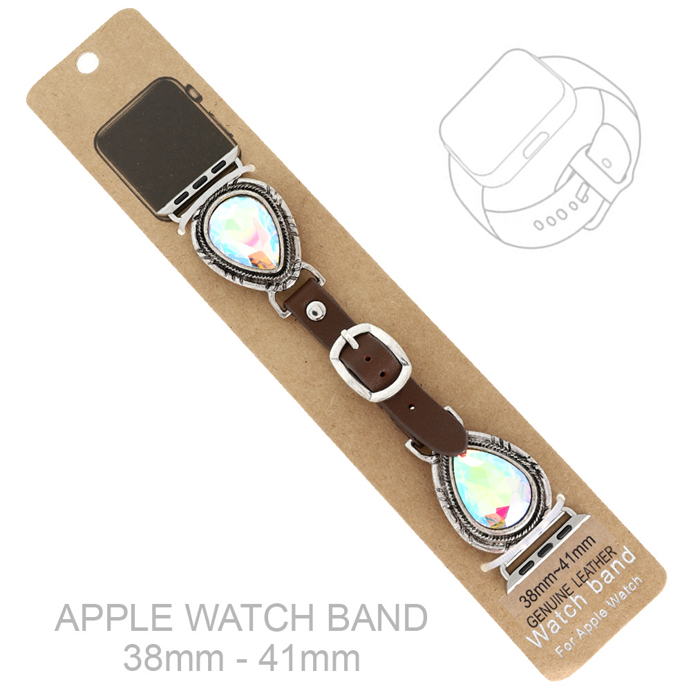 TWO-TONE WESTERN BOHO OVAL CRYSTAL CONCHO GENUINE BROWN LEATHER BAND FOR APPLE WATCH IN OXIDIZED SLIVER-TONE METAL