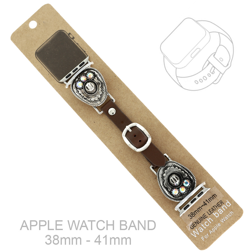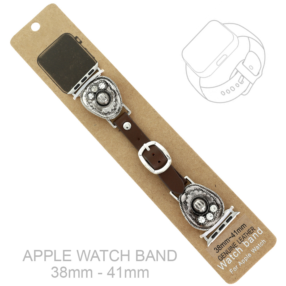 TWO-TONE WESTERN BOHO STONE COWBOY HAT CONCHO GENUINE BROWN LEATHER BAND FOR APPLE WATCH IN OXIDIZED SILVER-TONE METAL