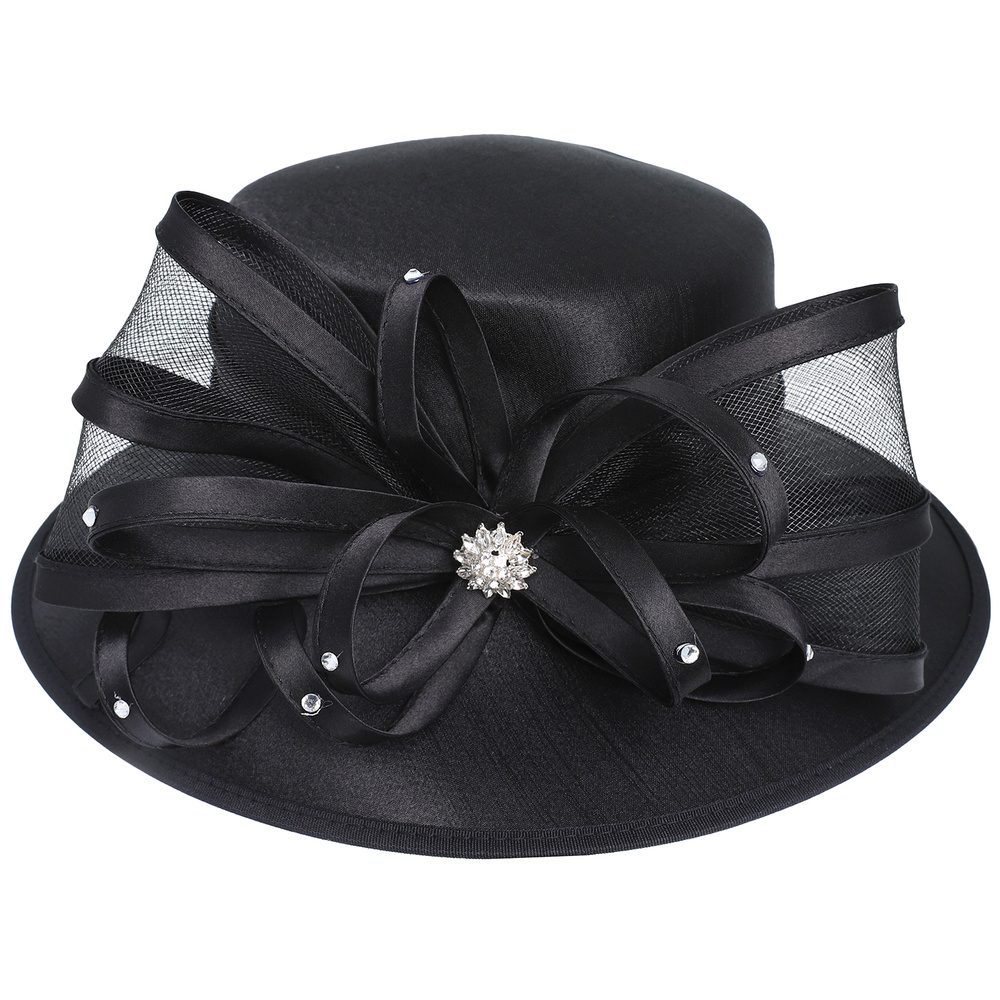 SUNDAY BEST KENTUCKY DERBY SOUTHERN STYLE CRYSTAL STUDDED BROOCH ACCENT LARGE BOW RIBBON DOWN BRIM DRESSY BRAID HAT