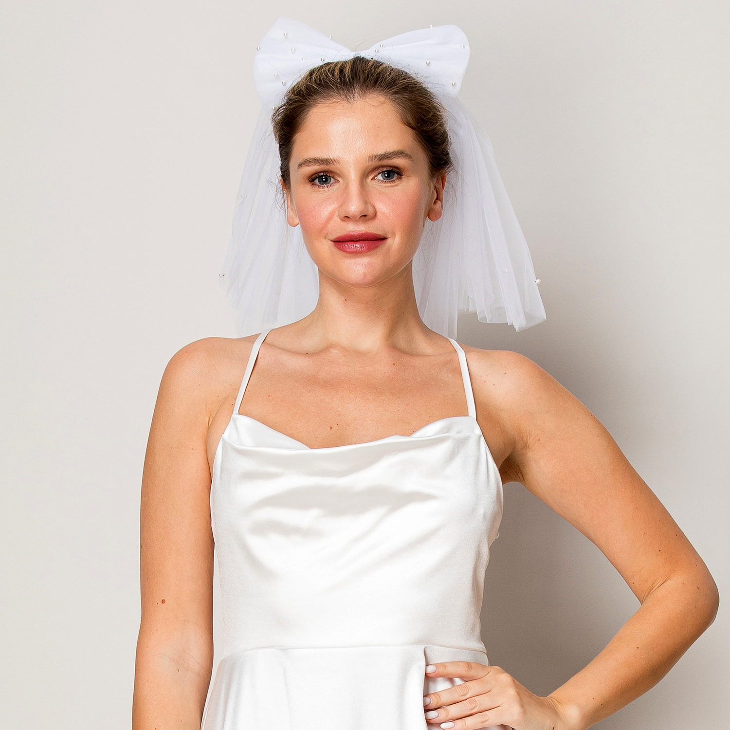 Bridal Wedding Bachelorette Short Bow Pearl Veil