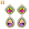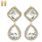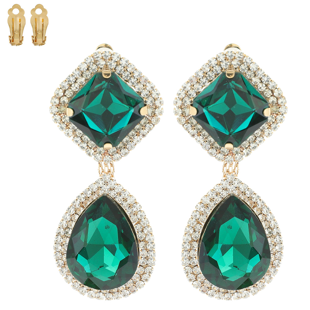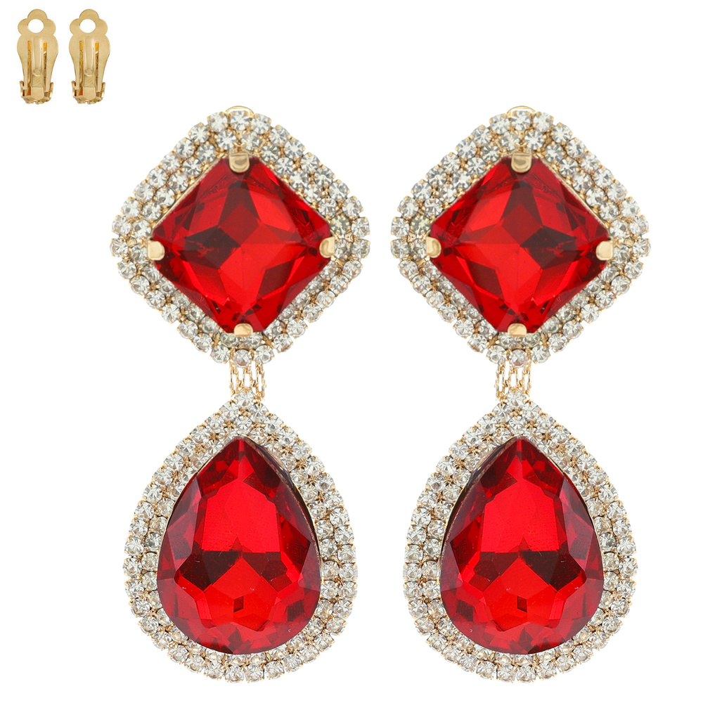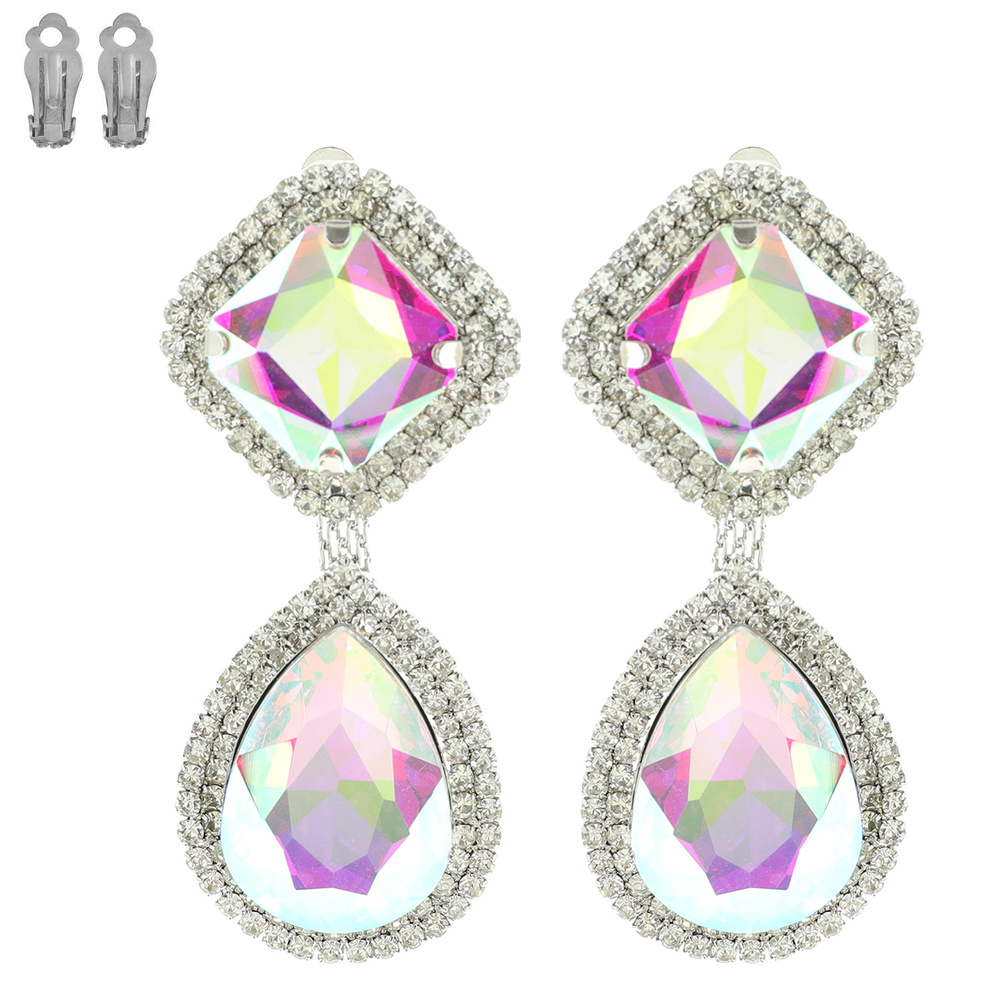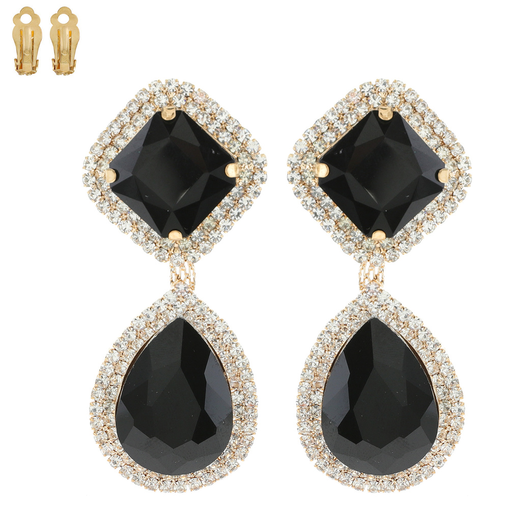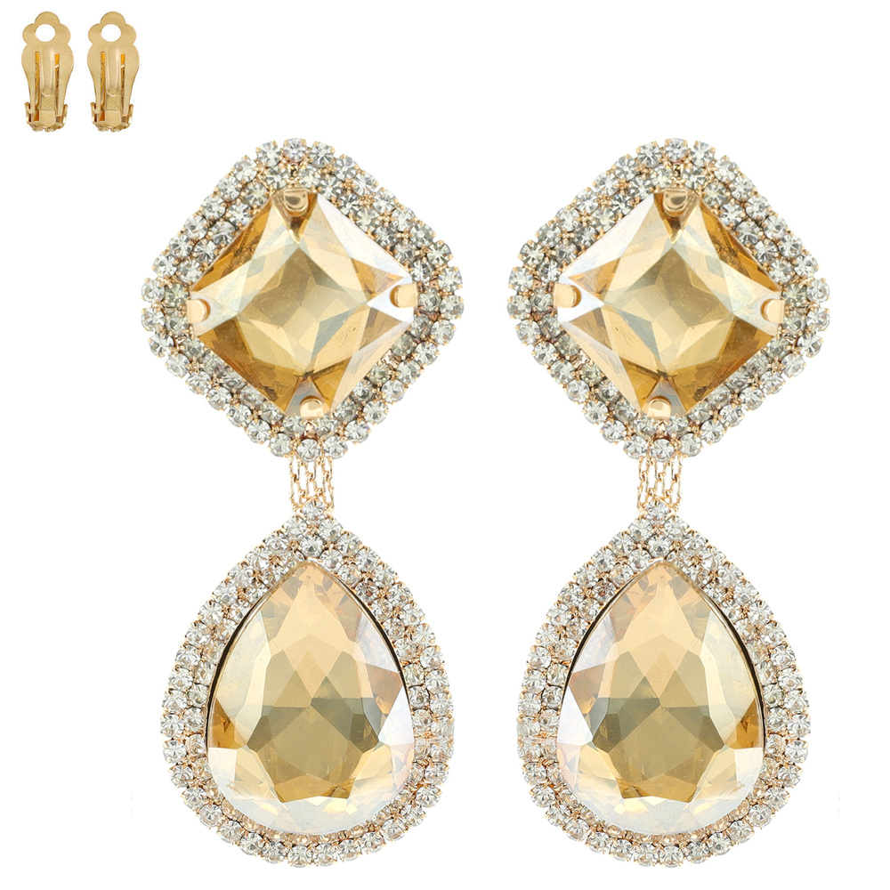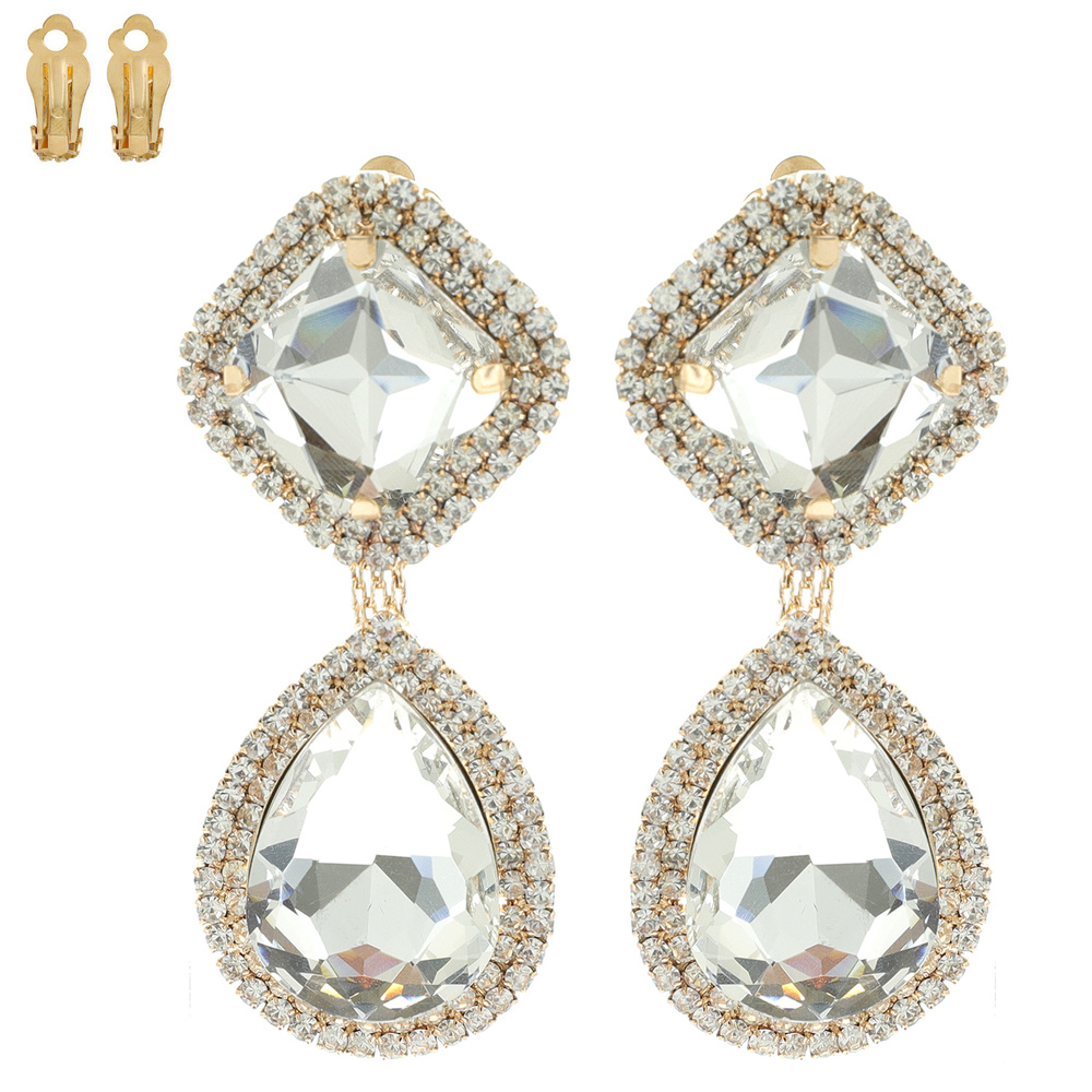 2-TIER RHINESTONE HALO CLIP ON DROP EARRINGS IN GOLD AND SILVER TONE METAL