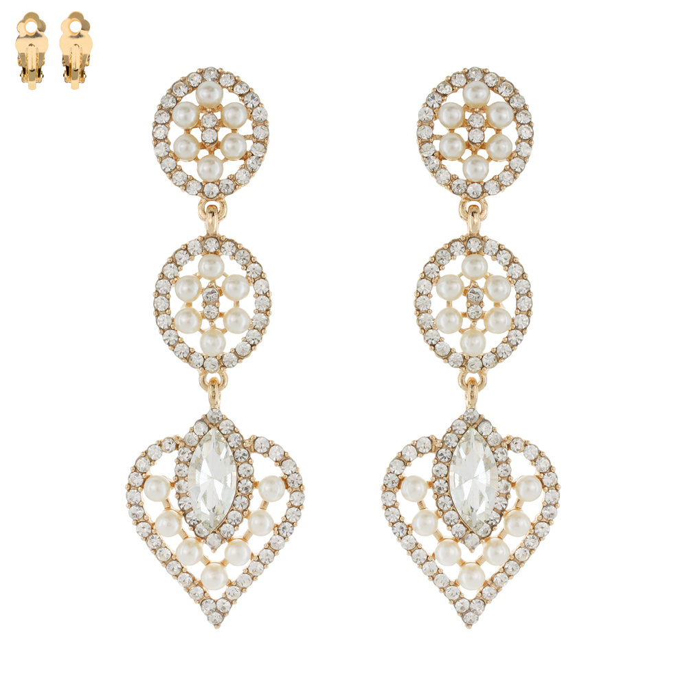 3-TIER HEART SHAPED RHINESTONE & SYNTHETIC PEARL CLIP ON DANGLE AND DROP EARRINGS