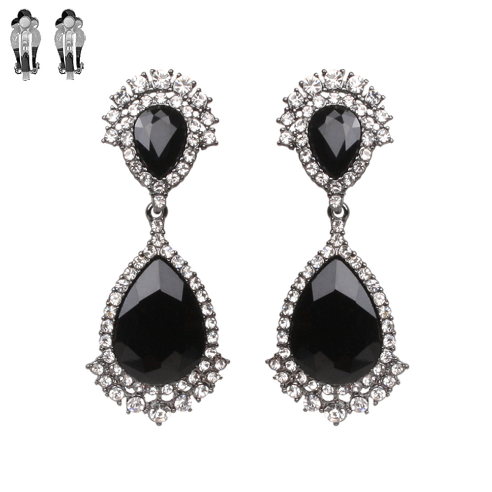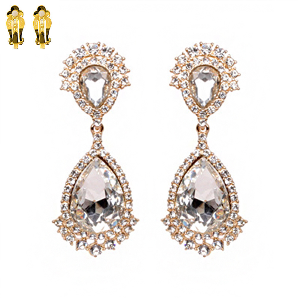 TEARDROP CUT HALO SET CRYSTAL DANGLE CLIP ON EARRINGS