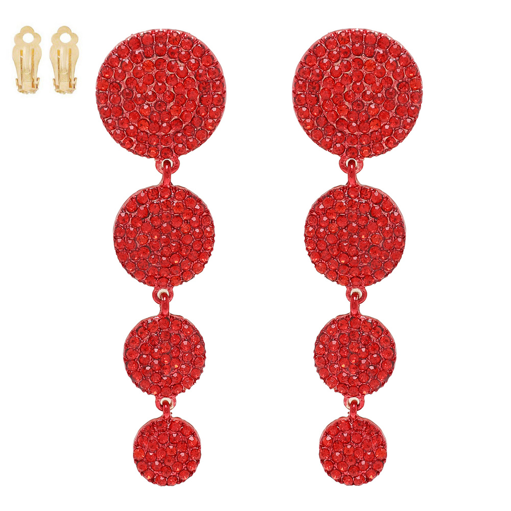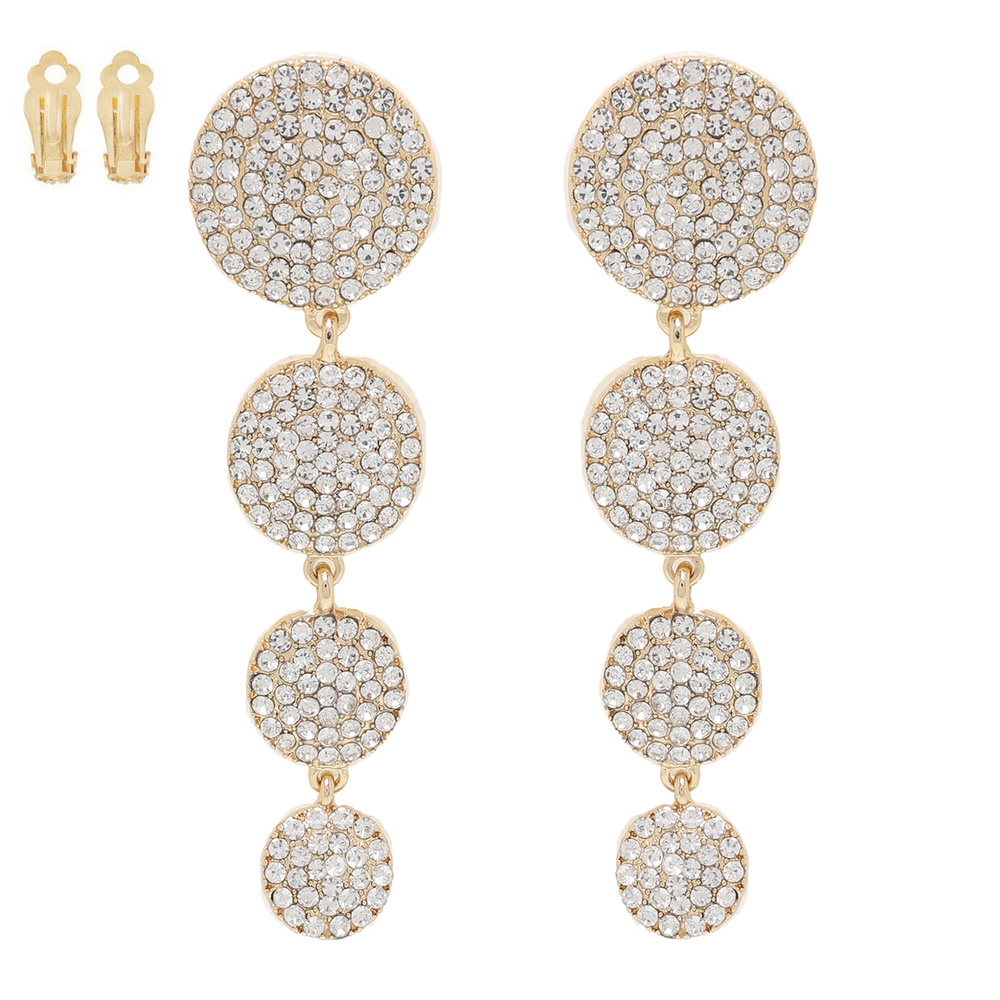 4-TIER CRYSTAL RHINESTONE PAVE DISC CLIP-ON LONG DROP EARRINGS