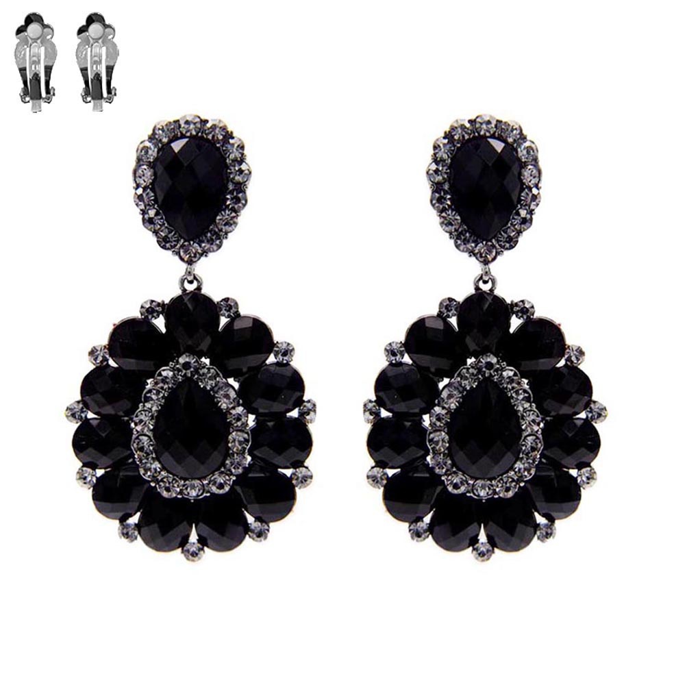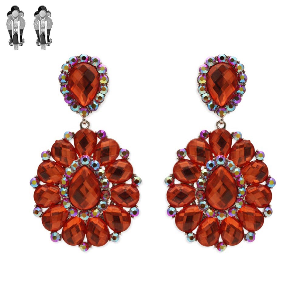 Dangly Teardrop Gem Cluster Metal Clip Earrings