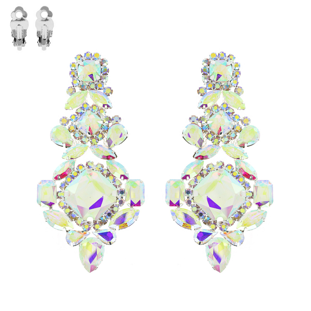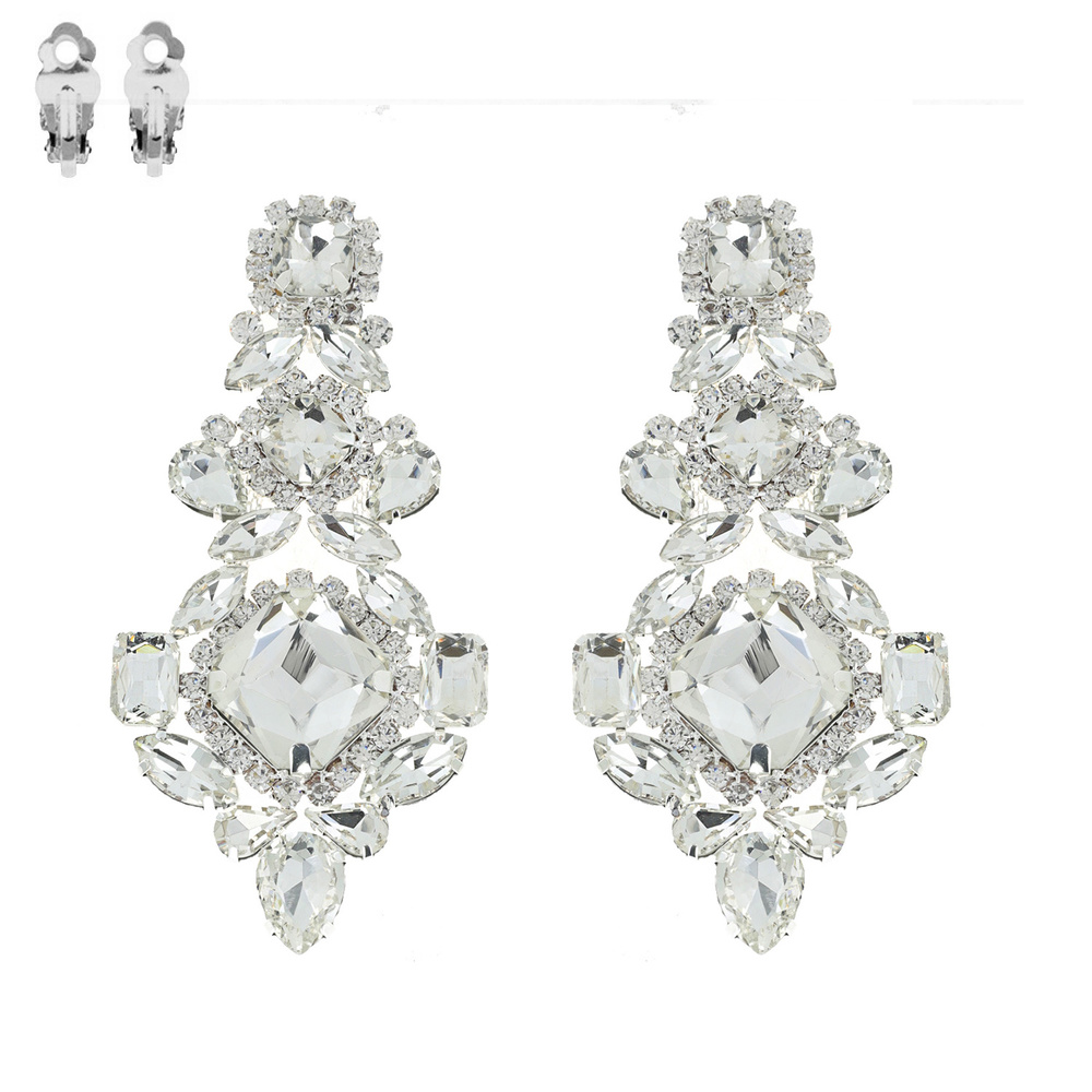Crystal Rhinestone Cluster Long Drop Baroque Clip-on Earrings