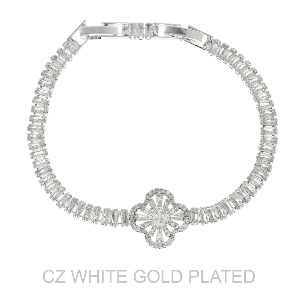 BRIDAL CUBIC ZIRCONIA BAGUETTE CUT QUATREFOIL TENNIS BRACELET IN WHITE GOLD PLATTING