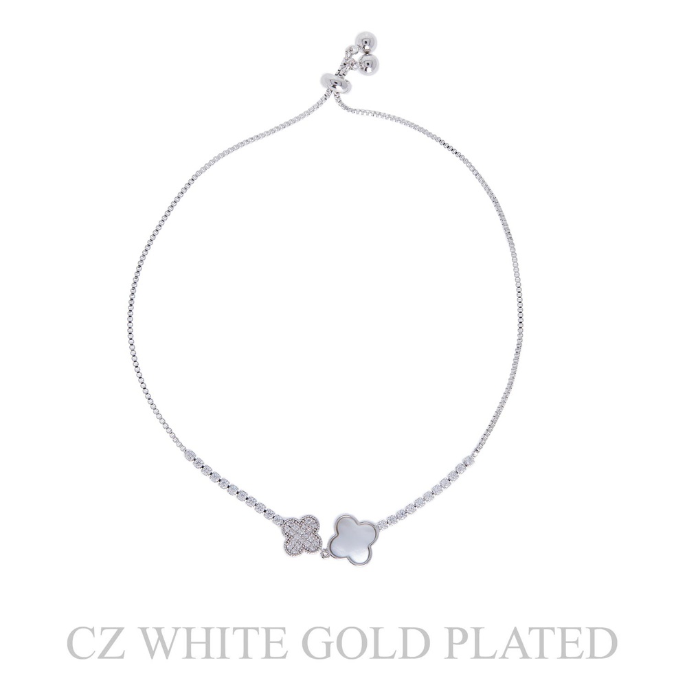 BRIDAL CUBIC ZIRCONIA MOTHER OF PEARL DOUBLE QUATREFOIL ADJUSTABLE SLIDER PULL-CORD BOX CHAIN BRACELET IN WHITE GOLD PLATTING
