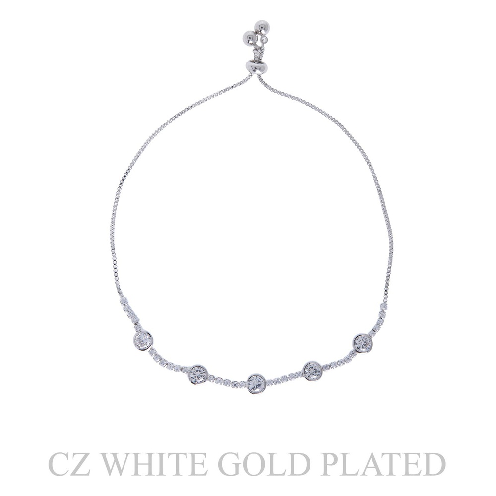 BRIDAL CUBIC ZIRCONIA BEZEL STATION ADJUSTABLE SLIDER PULL-CORD BOX CHAIN BRACELET IN WHITE GOLD PLATTING