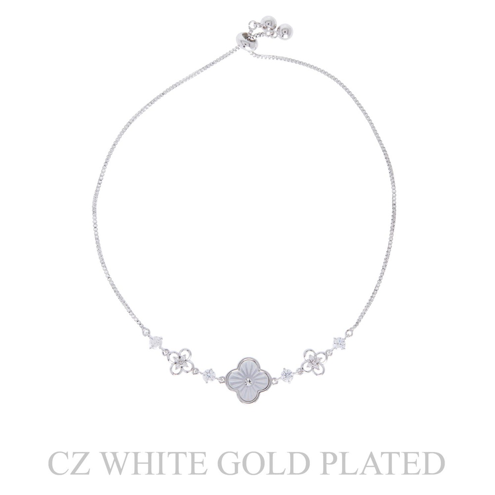 BRIDAL CUBIC ZIRCONIA QUATREFOIL LINK ADJUSTABLE SLIDER PULL-CORD BOX CHAIN BRACELET IN WHITE GOLD PLATTING