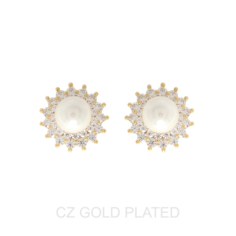 Gold Plated Cz Pearl Sunburst Halo Stud Earrings