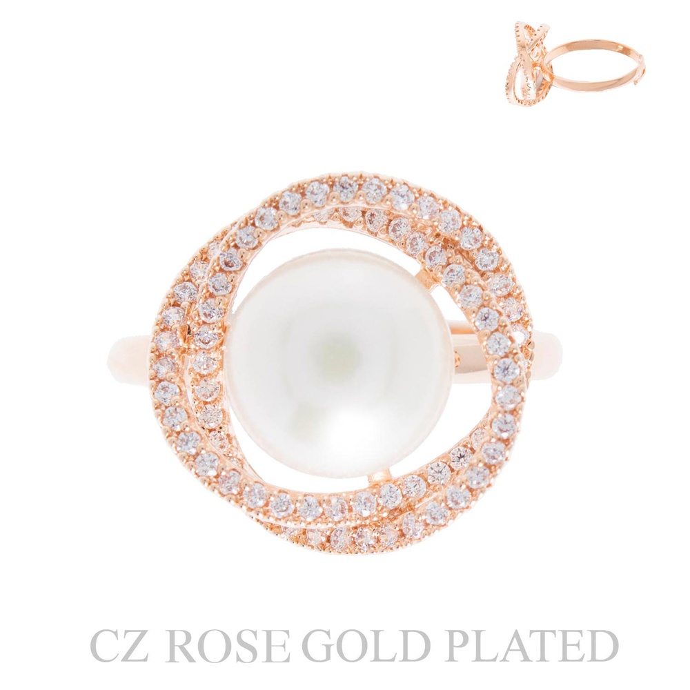 Gold Plated Cubic Zirconia Pearl Halo Adjustable Cuff Ring In Rose Gold And White Gold Platting