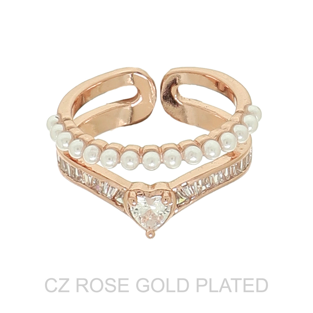 GOLD-PLATED HEART SHAPED CUBIC ZIRCONIA PEARL OPEN INLAY CUFF RING