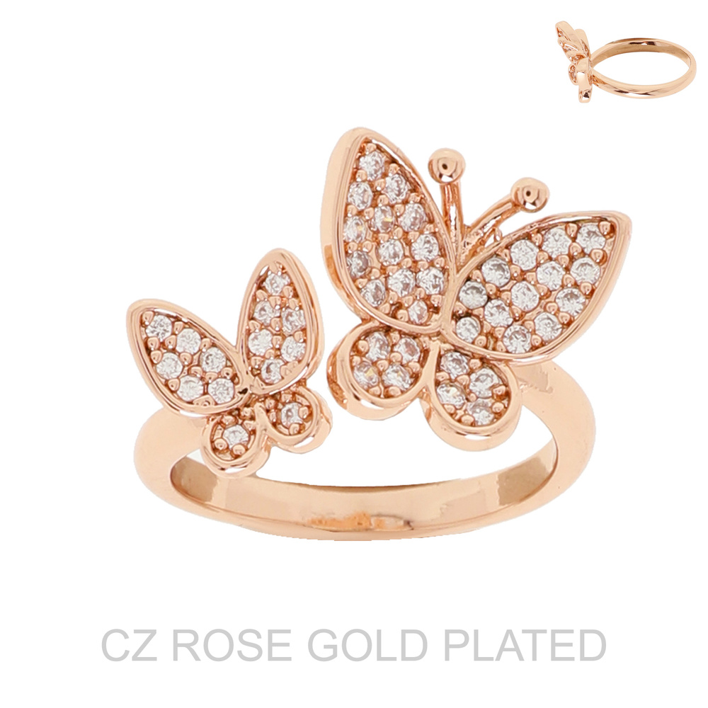 GOLD PLATED CUBIC ZIRCONIA DOUBLE BUTTERFLY ADJUSTABLE CUFF RING