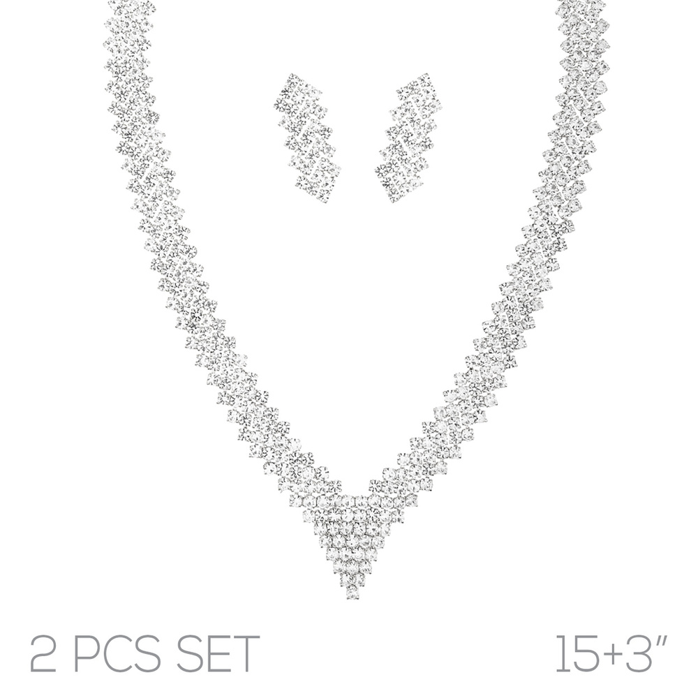 CRYSTAL RHINESTONE PAVE V-SHAPE NECKLACE EARRING SET IN SILVER TONE METAL