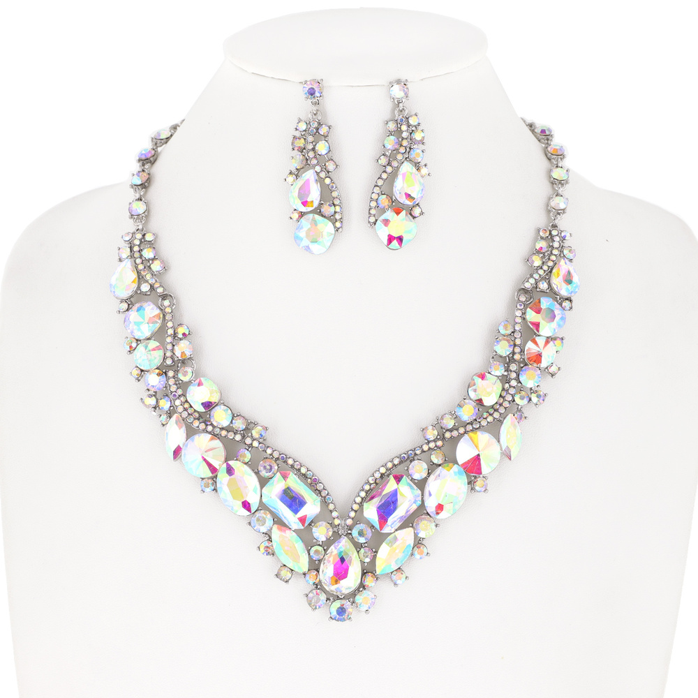 V Shape Stone Cluster Necklace And Earrings Set