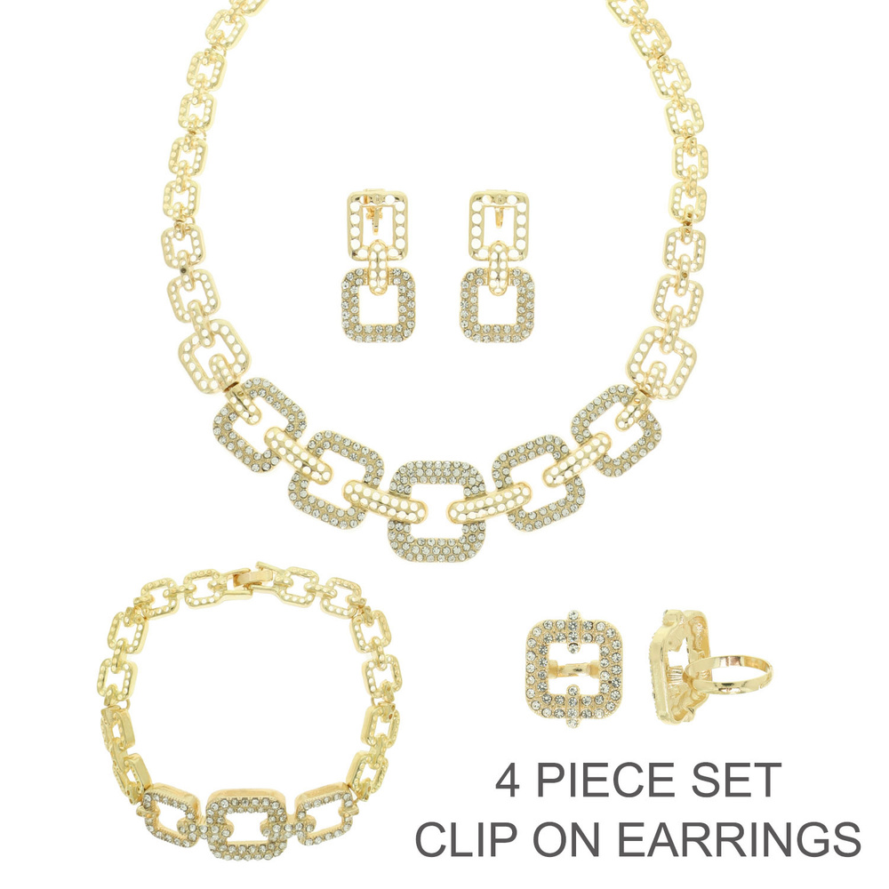 RHINESTONE SQUARE PAVE CHAIN LINK NECKLACE BRACELET RING AND CLIP ON EARRINGS SET