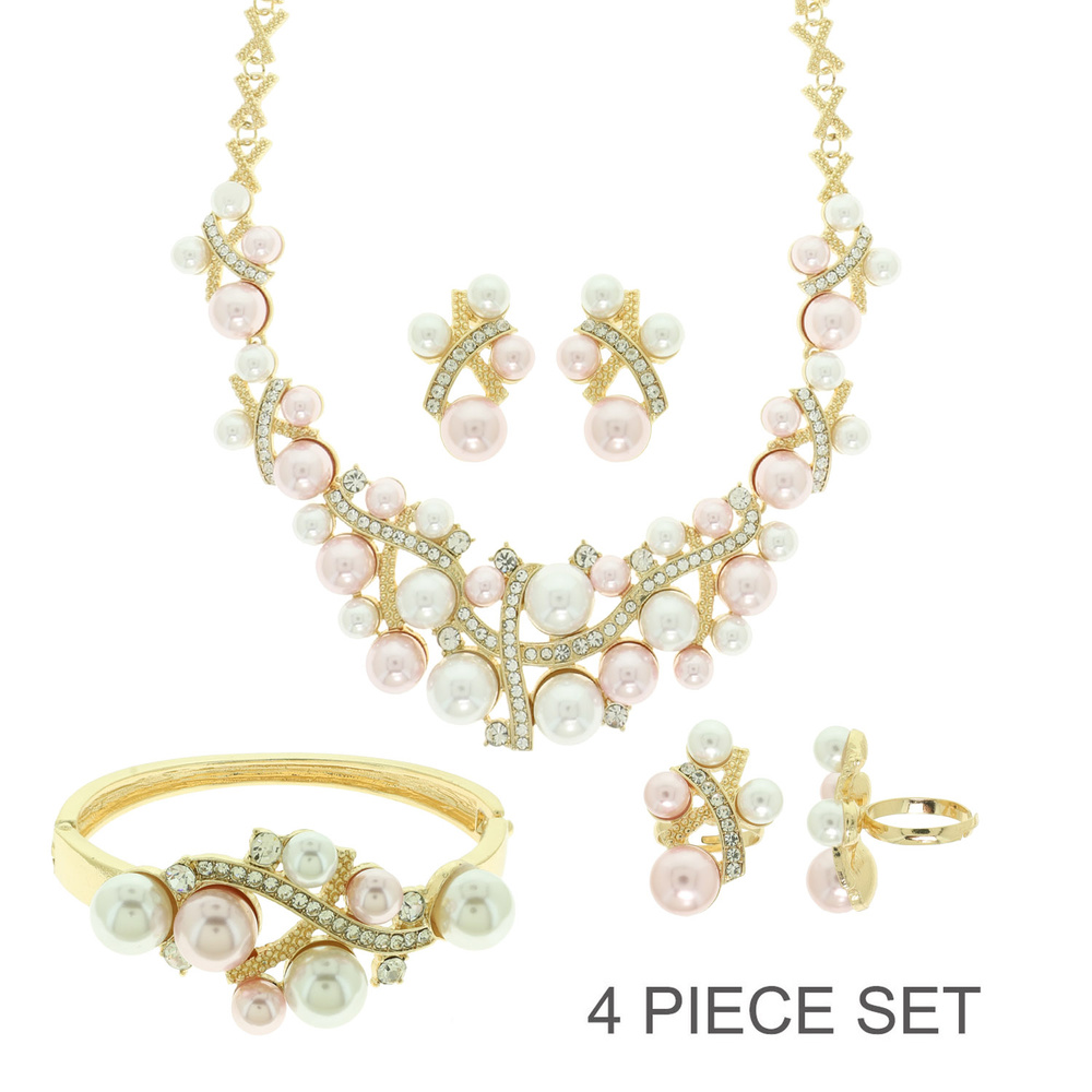 PEARL AND RHINESTONE FESTOON NECKLACE BRACELET RING AND POST EARRING SET